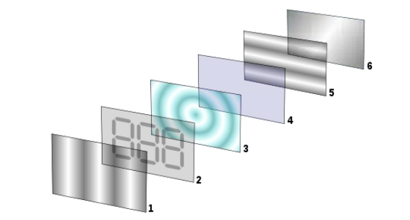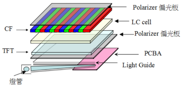 就是在两片液晶玻璃之间,利用TFT信号,来控制偏振光射出的方式,进而达到显示的目的。