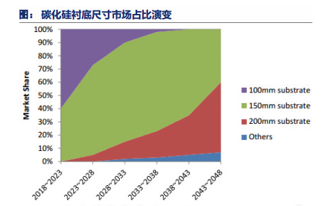 SiC 衬底是SiC 产业链中成本占比最大、技术门槛最高的环节,衬底对器件成本降低与规模应用起着决定性作用,扩大衬底尺寸是降低器件成本的有效方式之一。更大的衬底尺寸意味着单片SiC 晶圆能够制造出的芯片数量更多,晶圆边缘浪费减少,单芯片成本降低,这将驱使越来越多SiC 厂商从6 英寸向8 英寸转变。尽管当前8 英寸SiC 距离大规模量产还有一段距离,短期内不会对市场造成较大影响,但从长期来看,随着技术进步,材料生长与切割工艺等问题解决,8 英寸SiC 会加速到来,并与6 英寸SiC 呈长期共存态势。