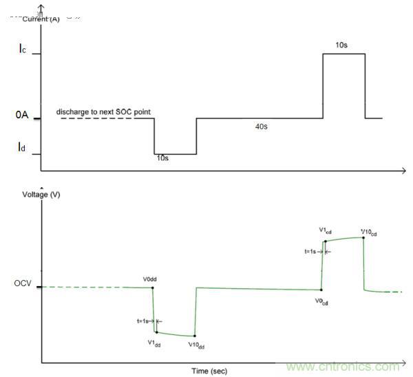 重复第二步和第三步,从而可测得90%至10%SOC共9个点的功率特性。在实际试验中脉冲电流一般根据被测电池特性决定(一般采用电池厂商提供的最大充放电倍率),SOC目标点可以根据具体需要调整。