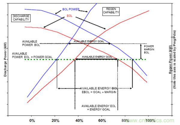 同时电池企业用以评估电池寿命终结的方法(容量衰减至BOL时的80%以下或内阻增加50%以上)是比较笼统的。作为整车厂可以根据实际性能需求进行更准确的EOL确认。下图以一款混合动力车型电池寿命分析为例:两条蓝线分别是BOL时刻的充放电功率特性,绿色虚线为整车实际需求工况。则在BOL状态下电池在20%~90%SOC区间内都满足整车功率需求,在可用能量上有一定的富裕。随着电池性能的衰减,两条红线代表了功率性能的下降,其可用SOC区间为40%~75%,到达EOL零界点。一旦继续衰减可用容量就无法满足整车需求。
